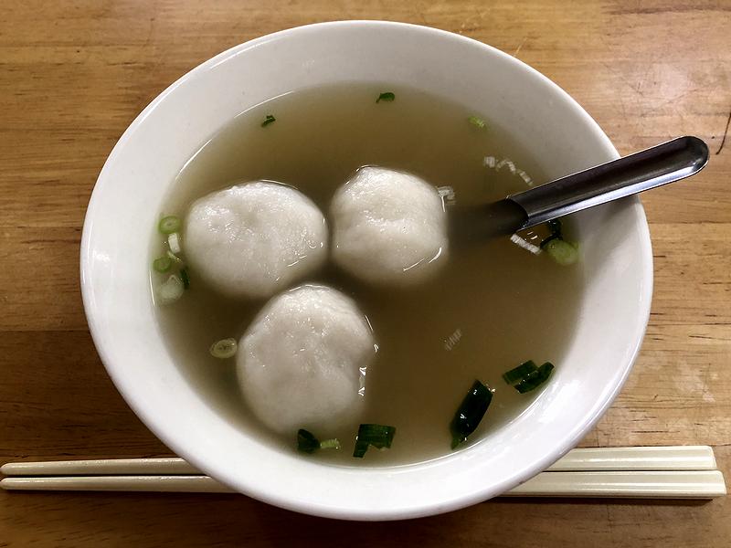 乾麺をいただいていると登場したのが、フィッシュボール入りスープである魚丸湯。写真だとあまり美味しそうに写っていないのですが、実際はもっと白っぽい色合いだったかと。で、こちらも早速いただいてみたところ、スープは魚系の出汁でしょうか?ごくアッサリしていて、かつ、味付けも薄塩だけという感じで。卓上のコショウが良く合いますが、ただし、入れすぎると勿体ない感が。またフィッシュボールはフワプリっとした食感で、中には醤油ベースで良い感じに味付けされた豚挽肉が入っていました。