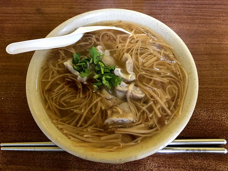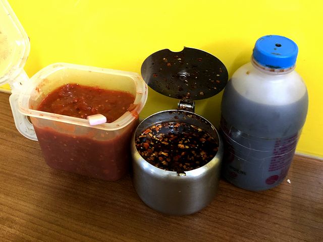 で、席で待つ事ほんの少しでまず登場したのがこちらの品。ちなみに「麺線(ミェンシェン)」というのは、台湾では良く食べられている麺料理で、日本の素麺程度の太さに打った麺を一度蒸してから干し上げ、それを鰹出汁などがベースのトロミが付いたスープで煮込んで作るそうで、具にはモツや牡蠣、香菜などがあしらわれている事が多いとの事ですが、こちらのは品名から判るとおり、モツが載っています。それで早速、付属の使い捨て?レンゲですくって(余談ですが、当地では器を持っていただく事はマナー違反となるようで。あと、箸は写真撮影の為に置いたもので、麺線をいただく時は基本的に使わないらしいです。)いただけば、強めなトロミが付いたスープはかすかな酸味にも感じられる程カツオ由来の旨味が効いているのですが、塩気は控えめ。それと一緒に優しい食感の麺線が口の中に入ってきて、これが、もう。また、具のモツは臭みなどなく柔らかく調理され、更に、そのモツが載っている付近にはおろしニンニクと香菜あしらわれていて、それらの香りやニンニクの辛味がとても良いアクセントになっています。で、最初は暫しそのままで味わった後、頃合いを見て卓上の調味料でカスタマイズ。まずは、ラー油の様な調味料(写真中央)をちょっとだけ投入すると、唐辛子などの辛味と風味が味の輪郭をハッキリさせる感があり、次に烏酢という黒酢(写真右側)をちょっとだけ投入すると、そのウスターソースにも似た風味、そして酸味が味わいを変え、これはこれで面白いです。
