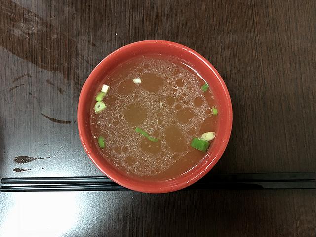 それと、一緒にいただいた味噌湯(ウェイツォンタン)ですが、こちらの方がカルチャーギャップに驚きました。というのも、鰹節と煮干しの出汁(その出汁ガラが具?として入っているので判明しました。)に、具は豆腐とネギという組み合わせは、日本の味噌汁とも共通するものがあるのですが、なんと味付けに、明確な甘味(砂糖?)が効かされているという。もっとも、これはこれで悪くないというか、「こういうもの」として味わえば、全然アリじゃないでしょうか。