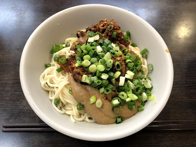 注文した2品は10分も経たずにほぼ同時に登場しましたが、そのうち麺料理は、お店の登録商標にもなっているらしい「老虎醤」を使ったであろうこちらの品を。それでまずは見た目ですが、麺の上にはまず芝醤(ごまダレ)が掛かるというか載っかり、更にその上、ネギで隠れてはいますが、キモである老虎醤が。その老虎醤ですが、唐辛子の他、細かく刻まれた様々な食材が合わさってできているようです。で、それらを混ぜてからいただいてみると、まずはゴマのまろやかさが前面に来ますが、老虎醤の、辛味を伴った複雑な味わいもしっかりと感じられ、これが何とも良い感じです。また麺は、乾麺を茹でたものでしょうか?茹でた後、締めてコシを出しているようには感じられませんが、若干硬質でバツっと切れるような歯応えがあり、これはこれで良かったです。