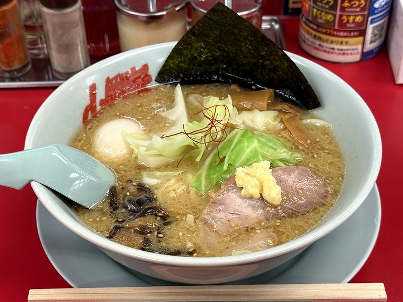 先日家人と大田原の「山」(山岡家の我が家での呼称)にお伺いした時、家人が食べていた期間限定の「濃厚白みそとんこつラーメン」。