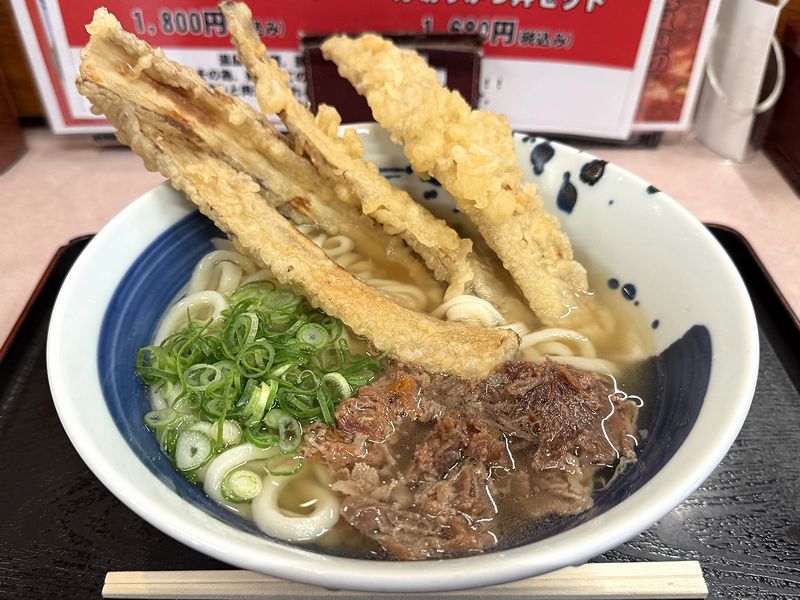 それがこの、ジャンボごぼ肉うどん。肉うどんにごぼう天が入ったものは、近年、九州北部を代表するうどんメニューになっている気がするのですが、どこのお店がメジャーにしたんですかね。