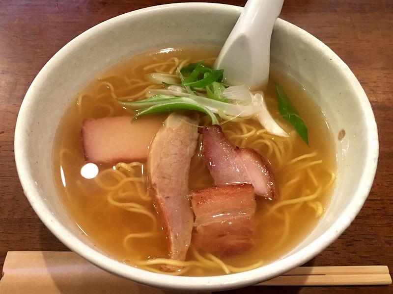 それで今回いただいたのは、出汁に山口県産「萩の金太郎」ことヒメジという魚を使用した、どる屋さん的名称だとROUGE(ルージュ)。以前、ROUGEと味噌との組み合わせはいただいたことがありましたが、こちらののプレミアムラーメンと言うべき「黄金」バージョンは今回初めてとなります。で、早速いただこうと丼に顔を近づけてみると、以前いただいた時に感じた、ヒメジ独特の甲殻類っぽい風味が、これはかなりマイルドですね。そしてスープを口に含むと、これが何とも美味い魚感。味付けは塩味で、その塩気はやや強めですが、それが出汁の甘味、そして味のふくらみを強調している感じがします。そこに合わせる中くらいの太さの麺は、固モチっとしたソリッドな食感。それと、さくら市のあさのポーク使用のチャーシューは、ほほ肉、ロース、バラの3種類が入り、食感もバラエティー豊か。肉に効いている八角っぽいスパイスがアクセントになりますね。それともう一つの具、軟白ネギである那須の白美人ねぎは、スープに浸かってしんなりしたところを、麺やチャーシューと一緒に頬張ると幸せになれます。