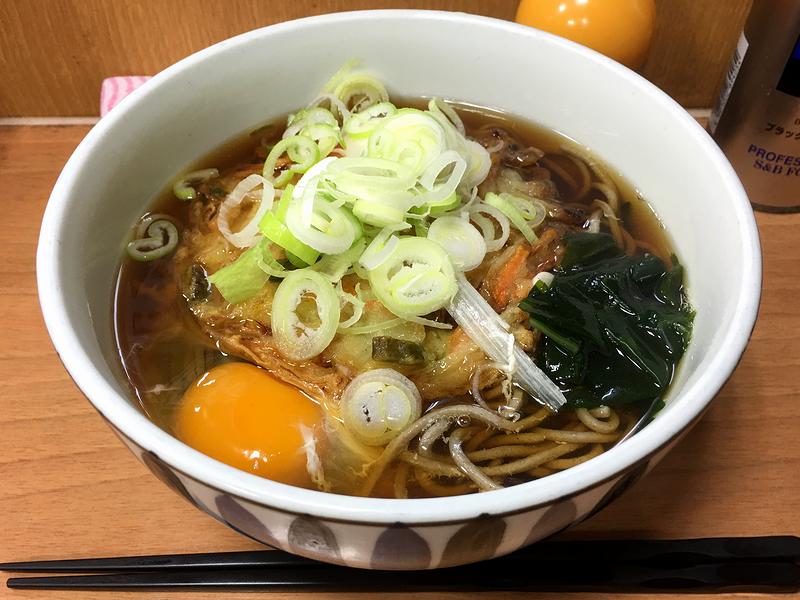そんな中選んだのは、結局いつもの組み合わせとなるこちらの品々。素早い調理で登場したものを受け取って早速、まずはツユからいってみたのですが、濃口醤油がメインに感じる関東的味わいで、出汁感はそこそこ。個人的に気になる塩気は、一般的には充分なレベルですが、あとほんの少し欲しい気もします。(しょっぱいもの好きなもので……。)またソバは、多分茹で麺だと思うのですが、ややモソっとした動きなれど歯応えは結構あるように感じます。そして具のかき揚げはややオイリーですが、柔らかく、ツユとの馴染みも良かったです。
