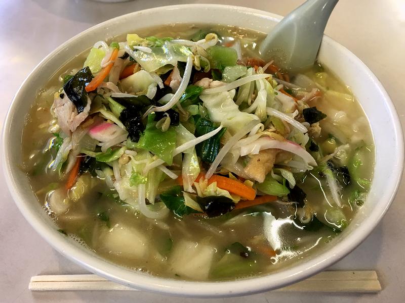 で、このお店でいただくと言えば、個人的にこちらの品。無理矢理別の品にトライしても良かったのですが、この日はどうしてもちゃんぽんが食べたかったんです。で、何度も食べて書いているので今更大きな発見があるわけではないのですが、逆に何度いただいても、チャンポンにしてはアッサリめなスープとたっぷりの具材(ワカメや油揚げが入っているのがここならではで面白いです。)、そして太めでプリプリ食感の麺の組み合わせは、毎回毎回、落ち着いていただけるというか、ほんと、安心する味なんですよね。