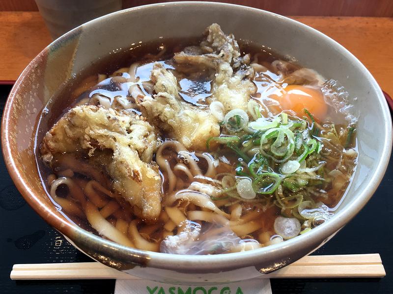 それで今回いただいたのは、氏家うどんに生卵を追加して。当ブログではこれまで、栃木県さくら市の地域ブランド品である『氏家うどん』について何度か取り上げてきましたが、さくら市のお隣である矢板市にあるこちらのパーキングエリアでも扱いがあるんですね。ちなみに、こちらのパーキングエリアでは、ノーマルなうどんの他に氏家うどんがあるというメニュー構成になっていて、氏家うどん(暖かいものの他、冷たいものもあり。)の場合は具として自動的に舞茸の天ぷらが入るようになっています。と、前置きが長くなりましたが、早速ツユからいただいてみると、出汁感はそこそこなれど醤油感は結構強めの当地らしい味わい。塩気も充分で、これなら具に天ぷらが入っても負けませんね。そして目玉の氏家うどんは、ウェーブというか捻れがかった形状と相まってチュルチュルっとした食感。これが氏家うどんの特徴でもあり、個人的にも好きなのですが、人によっては若干柔らかく感じるかもしれません。そして具の舞茸天は、舞茸自体にコリっとした歯応えがあり、味も良かったです。
