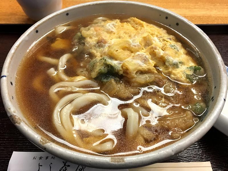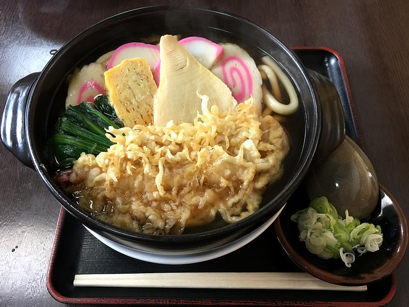 そこで私がいただいたのは、このなべ焼きうどん。蓋を取れば、大きなえび天が鎮座しているのが嬉しいのですが、卵が卵焼きだったり、ナルトやタケノコが入っていたりと、こちらのお店ならではのアレンジもありますね。で、早速、ツユからいつてみたところ、基本的にはいつもの、ちょっとひねたような風味のある甘味控えめで良い塩梅のものですが、煮た際にえび天など具材から出た味も加わっていて、これがまた。またこちらのお店で初めていただいたウドンは、モチッとした自然な食感が好みのタイプでした。