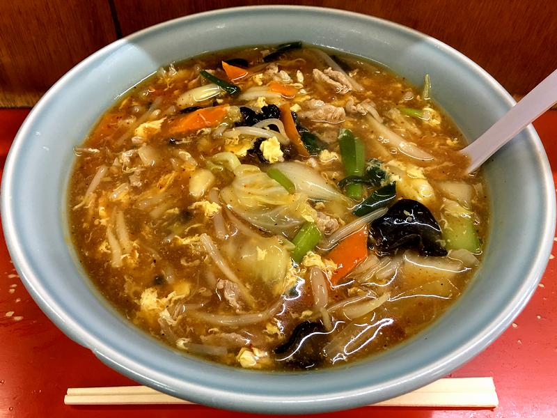 だからおとなしく醤油ラーメンでもいただけば良いものを、そんな感じなのでこちらの品を注文。で、早速、トロミの付いたスープからいただけば、熱々で、エッジの効いた辛味(ちなみにこちらの酸辣湯麺って、唐辛子の辛味が特徴的なんですよね。)と酸味が加わったものが容赦なく食道、そして胃を刺激します。そしてそのスープを纏った、細めの麺や、たっぷりと入る野菜と豚肉、溶き玉子といった具材も続けざまに口に運びますが、そのボリュームに途中で一瞬くじけそうに。ですが、お冷やを沢山飲みつつ、大汗をかきながら完食し、それから暫く経つと、不思議とスッキリしてくるというか。