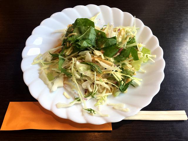 それで後述の品々を注文後、まず登場したのがサービスのサラダ。良い塩梅のドレッシングが野菜に丁度良く絡み、食欲をそそります。