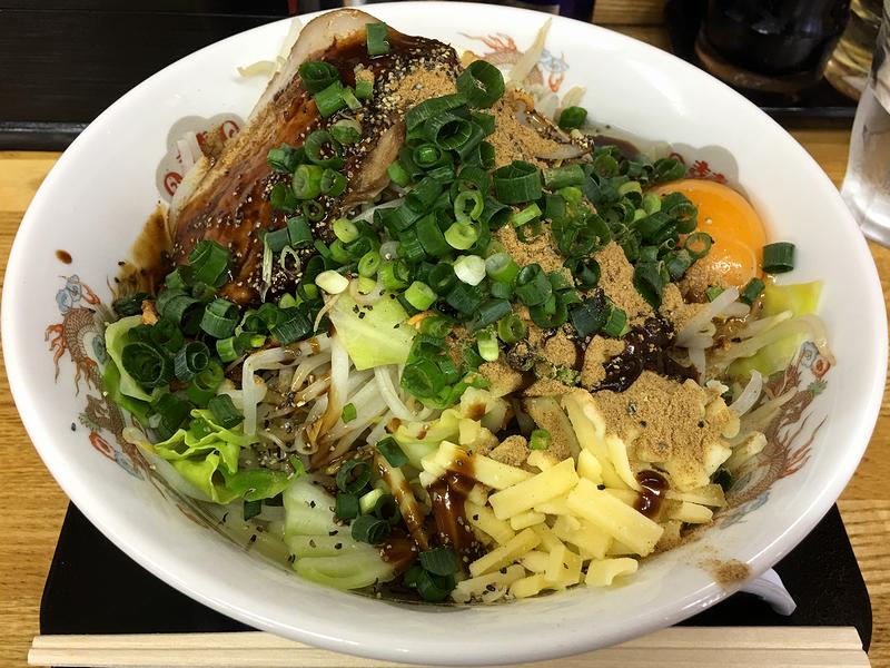それで今回注文したのが、以前一度だけいただいた時に、かなりの好印象だった特製混ぜそば。確か以前は大盛りまで同料金だった気がしたのですがが、現在は麺1.5玉までで、大盛りは無くなってしまったようでした。もっとも、量的に大盛りはつらくなってきたお年頃なので、全く問題ないのですが。(それでも、1.5玉で注文してしまったのですが。)