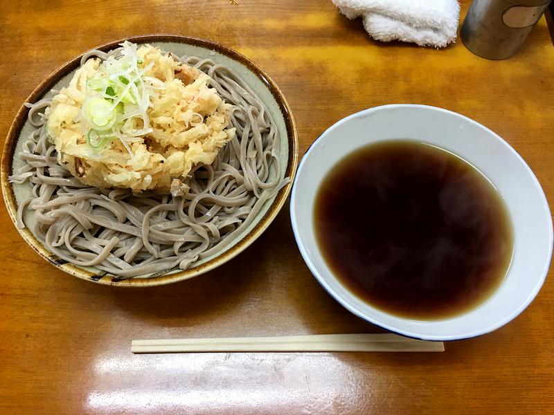 なのでいただくのはいつもの大冷し一択。この日は、注文から程なくして登場したのですが、器に盛られたそのソバを見て「あ、太い。っていうか広い。」と明確にわかる幅広さ加減。例によってかき揚げを甘さ控えめなつゆに投入し、あとはそのかき揚げと共に、幅は広いけど厚みはそれほどない、ソリッドというか良い意味でプラスティキーな食感のソバを一気にズルズルっと。最後はそば湯まで堪能してフィニッシュ
