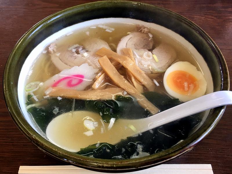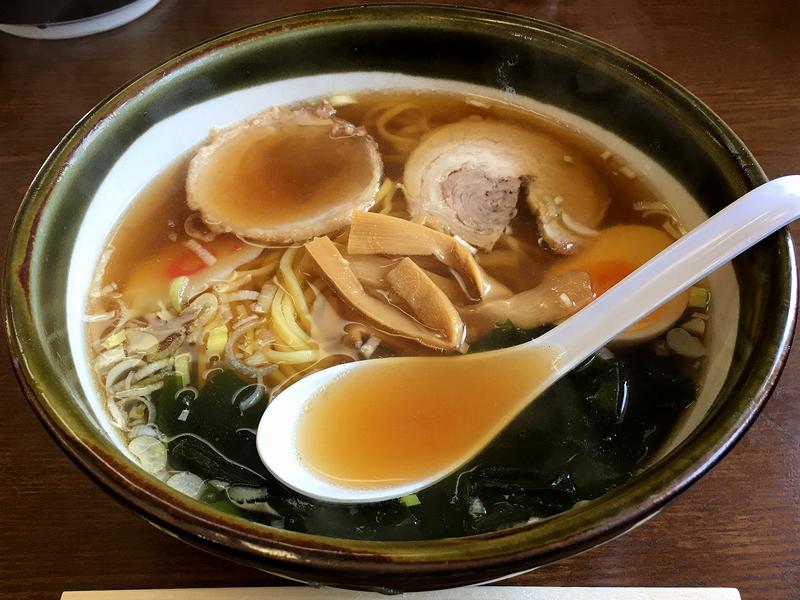 それで私がいただいたのは、お品書きの一番上に書かれていた醤油らーめん。事前に調べた時、こちらのお店の品はどれも盛りが結構良いと聞いてはいたのですが、実際にお品書きでその値段を見て(今時500円を切っているんですよ?!)にわかに信じがたかったところ、目の前に置かれた大きめの丼を見て、事前の情報は間違っていなかったのだな、と得心下した次第で。で、早速スープからいってみたところ、旨味のベースは動物系でしょうか?そこに醤油がキリっと効いた、これが何ともベーシックで安心できる味というか。そこに合わせる麺は、中太スクエア断面のストレートタイプ。このツルシコっとした食感やプリっとした歯切れの良さは、玉子麺故ですかね。そこに、小ぶりながら2枚のるチャーシュー、そしてメンマは、どちらも懐かしい感じ。海苔ではなくワカメが載るのですが、これも良く合っていました。あと、ゆで卵とナルトも良いですね。