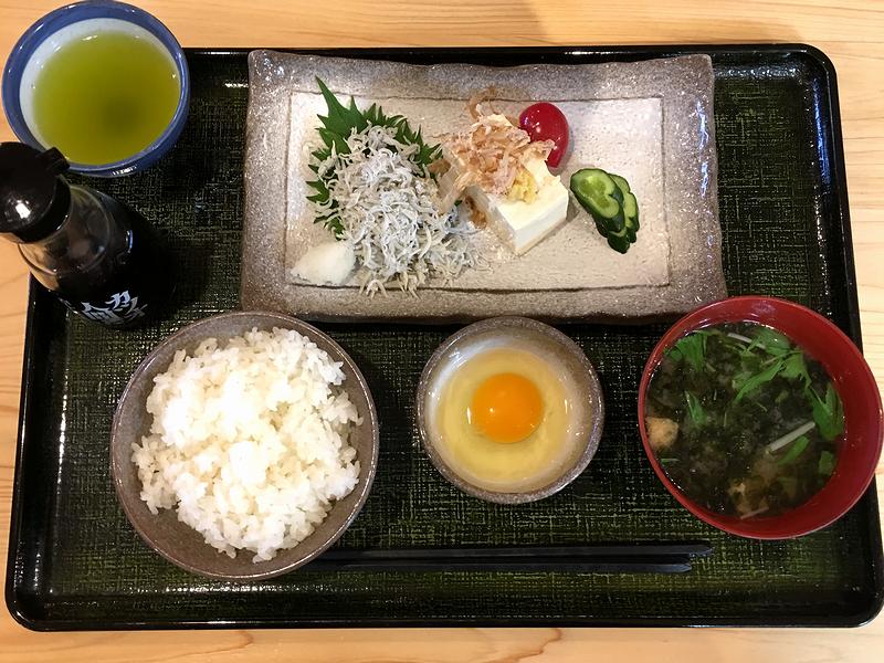 それでこちらのお店。朝食メニューでは700円の干物朝食がイチ押しのようでしたが、私が選んだのがこちらの品。この時たまたま、うどんとお米、両方食べたかったので、丁度良いのがあるなと思った次第で。それでまずはうどんからいってみたところ、個人的に慣れ親しんだ鰹節香るという感じではなく、スッと入ってくるような魚の風味と旨味。これっていりこですか?そこに薄口醤油ベースと思われる良い塩梅の味付けが加わり、更にそこに、アオサで磯の香りがプラス。あとウドンは、変にコシが強くないのが自然で良かったです。あとおにぎりはお米が美味しく、添えられたお新香、特にプチトマトのが良い感じでした。