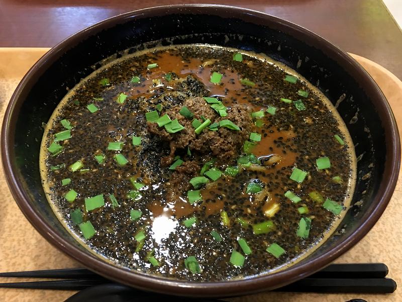 受け取った黒胡麻タンタン麺は、黒胡麻が沢山浮くスープにはニラが散らされ、中央には味付け挽き肉がワンスクープという感じで。早速そのスープからいってみたところ、黒胡麻の風味は強いけどさらっとした口当たり。そこに、ちょっと甘味のある味付けがなされ、唐辛子の辛味は個人的にピリ辛程度。加えて山椒のスッとする風味、そして痺れがちょっとだけ感じられます。こういう所なので、あまり攻めた味にはしていないと思うのですが、それでいてちょっと個性も感じられる、上手いところをついた味わいですね。また麺は、若干細めの縮れ麺で、中庸な感じ。あと上に載った具の挽き肉は良い塩梅で、混ぜ込むとスープの味をアップさせるような気が。で、一通り麺を啜った後は、残っていたライスを丼にイン!底に沈んだ挽き肉共々いただけば、これが悪くないというか、昔は担々麺のスープにご飯投入は個人的にナシだったものの、いつの間にか普通にするようになってしまったなぁ、と。