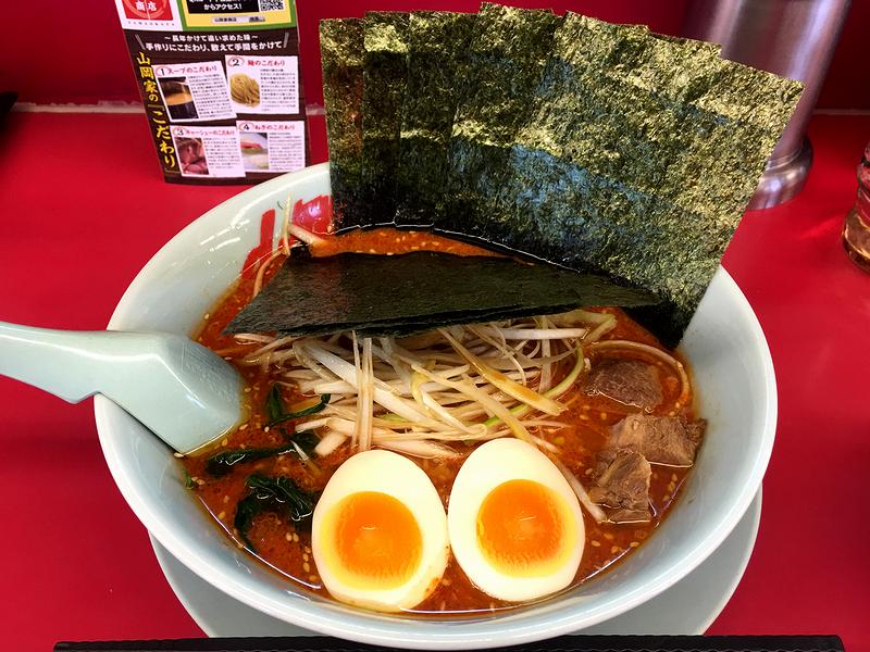 で、早速スープからいってみたところ、豚骨と味噌、そして唐辛子の合わさった暴力的スープは、何度いただいても理屈抜きで良いですね。このところ、胃の調子の所為もあって激辛にするのは控えていたのですが、やっぱりこれくらいの辛さの方が、個人的には旨く感じます。あと味の濃さも、「味薄め」でバッチリ。辛味噌の辛さ激辛でお願いすると、個人的には味が濃く感じることが多く、このあたり、同じ山でもお店というか作り手によって若干ブレがあるので、リスクを負いたくない時は薄いよりは良かろうと「普通」でお願いするのですが、こちらというか今回は丁度良い濃さでした。あとは、ニンニクをスープで溶いて全体的に投下し、それがかかったネギを一部ライスに移植。麺を啜り、スープを啜り、海苔はスープに浸してからライスと共に。ホウレン草を箸休めにして、チャーシューと味玉もライスと共に。最後は、残ったスープをライスにかけてフィニッシュと、一気に堪能しました。