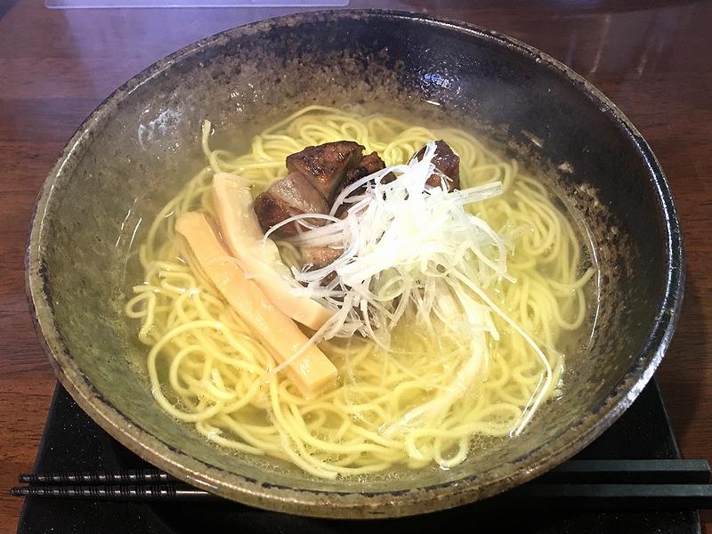 目の前に置かれた丼からは、既に何とも食欲をそそる鯛っぽい香りがしているのですが、さっそくスープを一口いってみたところ、鯛・鯖・鯵を使ったという出汁は、しつこくないけど重層的な、それぞれの旨味や香りが口の中に広がって、これが、もぅ。ほんと、朝にふさわしい優しい味わいというか、身体の中にスっと入ってくる感覚というか。それでいて、ちゃんと余韻も残ります。また細めの麺は、そんなに主張は強くないのですが、逆にスープとの一体感が良い感じ。更に、乗せられた麺は白髪葱と共にいただくと、旨さがグンっとアップします。それと具は、塩味のメンマも良いのですが、個人的には焼き豚が印象的、外はカリっと香ばしく、中は肉の食感がジューシーで適度に柔らかく、これが、また。