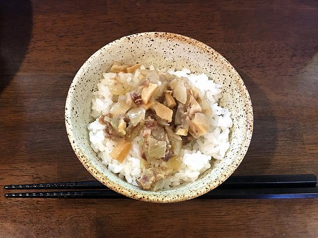 あとセットのご飯物は、標準のらいめしに。小ぶりな丼に入ったご飯の上には、刻んだ焼き豚とメンマ、タマネギを炒めたものが載っているのですが、この中でもタマネギが効いているというか、その甘味と旨味が加わることによって、全体の味をまとめるだけでは無く、味わいをグレードアップさせている気が。量的にも、ラーメンとセットでいただいて丁度良い感じでした。