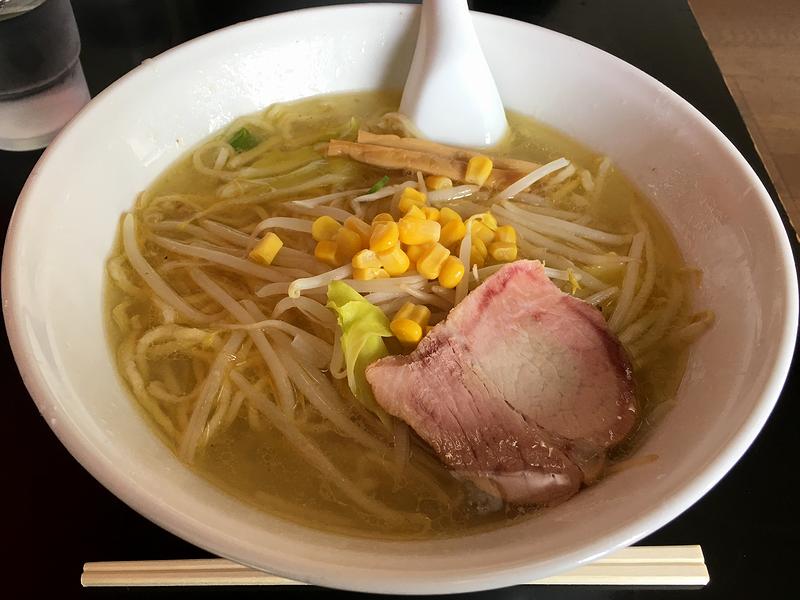 それでまずは、私がメインでいただいた塩味のこちらの品から。とりあえず表面に油が多めに浮いているスープからいってみたところ、クリアというより、鶏の旨味が厚く出手居るように感じ、表面の油は鶏油でしょうか?鶏の風味も結構強く感じます。また塩気は丁度良く感じ、塩気というよりも鶏の旨味・風味が味の中心になっているように感じました。そして、そこに合わせるのが店主さん自慢の手打ち麺。以前いただいた時の記事には「もちっとした食感」なんて書いてしまった(当時は、白河系の手打ち麺=もちっとした食感という先入観があって書いたかもしれませんが。)のですが、それよりも、ポコポコするというかエアリーというか、軽快な口当たりが印象的で、もちろん、噛めばちゃんとした手打ち麺らしいコシや歯応えも兼備しているという。それと、具のチャーシューも印象的というか、スモークでも醤油でもない、肉風味という感じの味わい。そしてその食感も、肉肉しい感じは残しつつも柔らかめという個人的にどストライクのものでした。あと、メンマは強く主張せず、どちらかというとラーメンとの一体感を重視されているんでしょうか?更に、塩味のスープと合うモヤシの他、キャベツとコーンというのが特徴的に感じました。