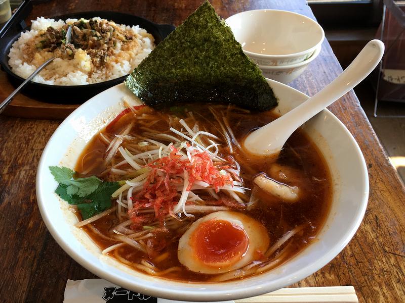 それで気になった品というのが、こちらの笠間担々麺。茨城県笠間市にあった今は無き某店のメニューを、花の季流にアレンジした一品とのことです。で、パっと見、ザク切りにされた白ネギ、そしてザーサイと挽肉が一面を覆い、上に振りかけられているのは山椒でしょうか?そのビジュアルは、日本で一般的な担々麺とは全く違うものなのですが、いただいてみても同様で、まろやかなスープは胡麻胡麻っとした感じはなく、絶妙に火を通された地元産ネギの甘味と歯応え、そして僅かにツンと来る感じや、たっぷりと入るザーサイの主張が強いです。それと唐辛子由来の辛味は、個人的な感覚では適度というか、決して辛すぎない程度。また細めの麺は、ラーメンと共通でしょうか?ツルツルっとした食感が良いですね。あと、挽き肉もたっぷりと入っていて、満足度も高いのですが、唐辛子をはじめとするスパイスのお陰か、いただいているうちに結構汗をかきました。