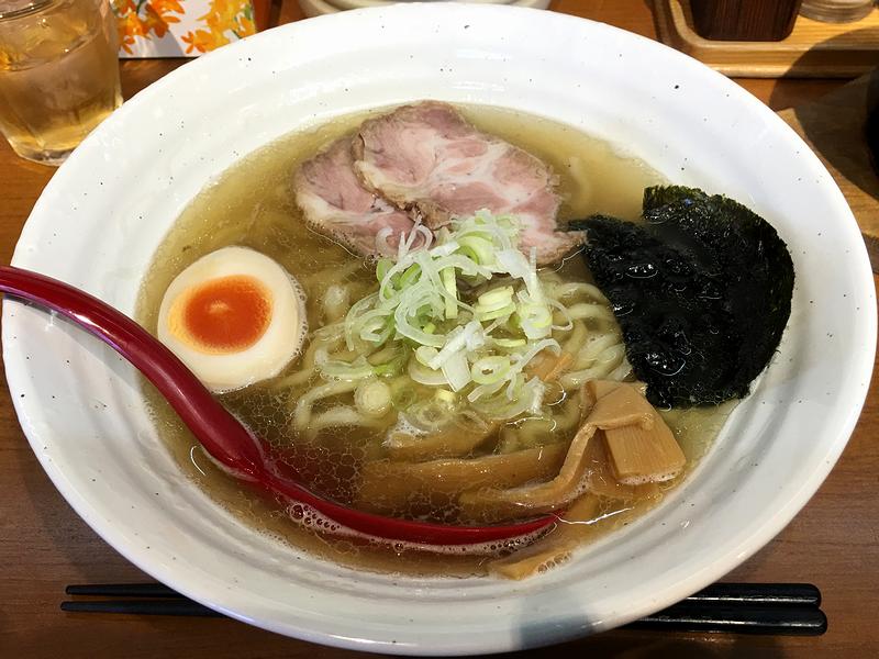 それで今回は、「これまでいただいた事が無い品を」ということでいだいたのがこちらの品。煮干出汁で塩味って、わりと珍しく感じたというのもあるのですが。で、早速スープからいってみたところ、見た目からもわかるように、最近流行りの煮干し丸ごとドロドロだったり、これでもかと煮詰めたというタイプではなく、あくまで出汁としての使用。ですが、煮干しの風味、そして特有の旨味はしっかりと感じられる程度には効かされています。また、味付けの塩気はビシっと強めに感じました。そして太めの麺は、かなり硬質な歯触り。前述の塩気と相まって、かなり硬派なチューニングですね。それと具は、ホロホロ食感のチャーシューなど、いつものみやこ家さんクオリティです。