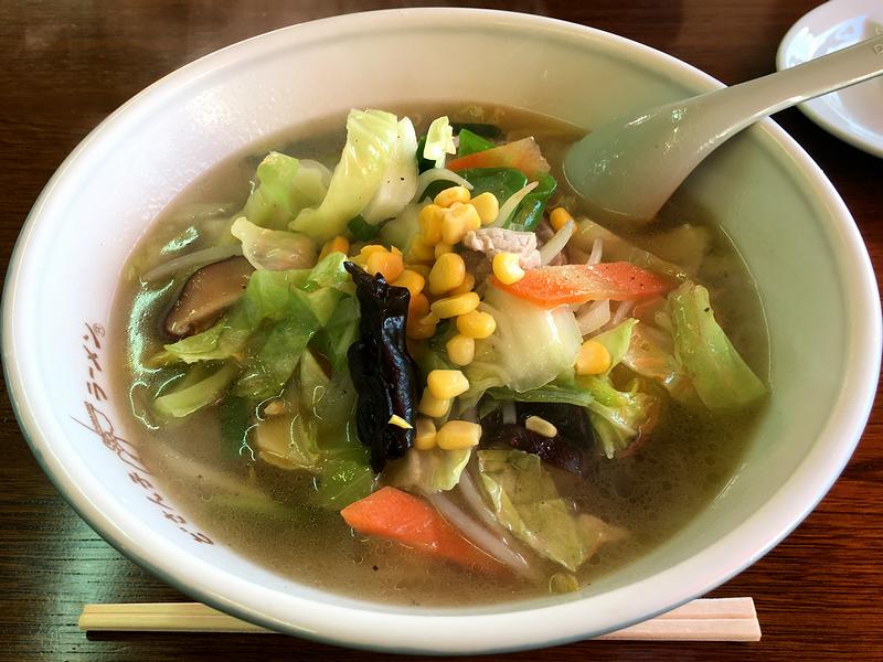 それでこちらに昨年11月、家人が(いつものみそバターではなく)ベーコン焼定食にチャレンジするためお伺いした時、「今度は私も、いつものみそバターではなく、別の品を」と思った私が今回いただくのは、この、野菜たっぷり塩タンメン。こちらのお店には、野菜たっぷりと付かないタンメン(650円)もあるのですが、折角なので「たっぷり」の方を。で、登場した時、丼がいつものみそバターのよりもワンサイズ大きいことに気がつきました。なので、写真だとあまりたっぷりには見えないのですが、いただいてみると野菜が量的に結構入っていて、また種類も、キャベツに白菜、モヤシ、人参、椎茸、キクラゲ、の他、タンメンには珍しいピーマンに筍、コーンとバラエティー豊か。これらが豚肉と炒められ、その旨味が、ベースとなるあっさりしたスープにそっくり加算されていて、もう。あと、中太でムチポニョっとした食感の麺は、ラーメン類と共通ですかね?こちらのスープでも悪くない相性です。