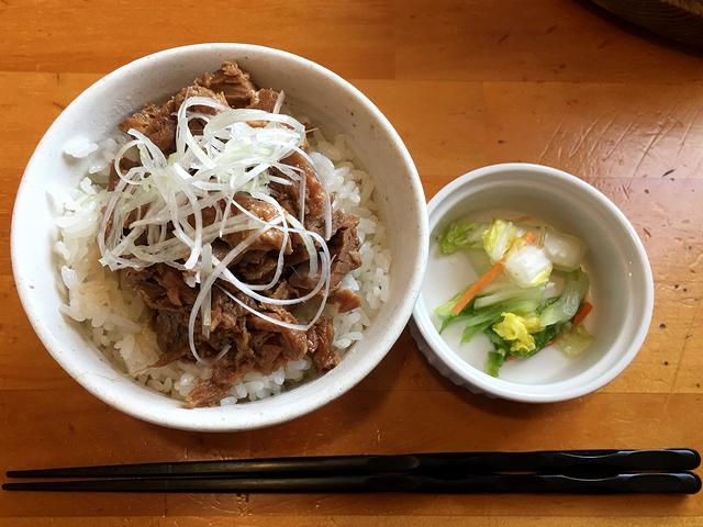 こちらも、一緒にいただいた品。で、チャーシュー丼って、切って載せてタレを掛けただけ(それだけでも十分ですが)のお店が多い中、こちらのは手が込んでいるというか、ほぐしたチャーシューがタレとしっかり一体化され、更に、器もチャーシューも温かくなっているという。で、またタレがご飯を良い塩梅で食べさせてくれる濃さで良かったです。