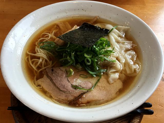 こちらは、私がいただいた品。刻んだ白ネギを固めたものと青菜が特徴的なビジュアルですが、他にも、澄んだスープには黄色い油が結構、また一部には揚げネギっぽいものも浮いています。それでまずは、ツユを一口いただくと、旨味、塩気とも充分。風味的に一番主張するのは白ネギなのですが、旨味の元を探ろうとしても、様々な素材から出たと思われる旨味というか、どれかかが突出して感じられず、更には、油のコクや揚げネギっぽいものの風味も突出せずに加わって、全体的に複雑な味を作っている印象です。また麺は、結構細めのストレートタイプ。太さのわりにはハリのある口当たりで、量もたっぷり。そして具ですが、ホロっホロのチャーシューは結構スパイシーに感じ、ワンタンは皮がチュルっチュルで餡しっかり。味付け玉子は黄身がトロっトロで味加減は濃すぎず良い感じでした。