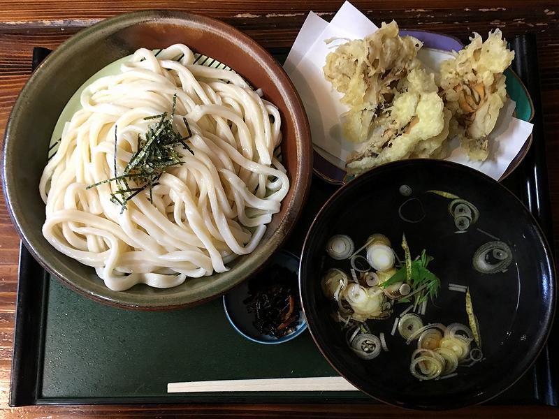 それで私が注文したのが、前回お伺いした時は品切れとなっていたこちらの品。並盛りだと950円なのですが、150円増しの大盛でお願いしました。で、登場して早速、まずはウドンのみで何も付けずにいただいてみたのですが、これがまた。前回は鍋焼きうどん=ツユで煮た芯まで温かい状態だったので、どちらかというとシコシコ感というよりもっちり感が支配する食感だったのですが、冷たい状態のこちらは、シコシコ感が増している感じが。それも、いかにもグルテンっ!という過剰なもので無く、歯を入れると若干硬質ながら適度に押し返すようなところが個人的には当地のウドンらしくて良いんだなぁ、と。そして次に、ツユに浸けていただくのですが、そのツユ、適度な出汁感に甘さ控えめの味付けが加わって、これも好み。そこに、揚げたての舞茸の天ぷらを一部投入すれば、これはもう、間違いようのない味というか。ちなみに、使われている舞茸は、相当立派なサイズで、歯応えのあるしっかりとしたもの。揚げ方も上手く、これだけで延々いけますね。あとは、途中で舞茸天を挟みつつ、ウドンをツユに浸けひたすら啜るのですが、大盛だと結構ボリューミー。あと、ツユには柚子が入り、ウドンの上には刻み海苔が掛けられていたのですが、これらが結構主張するというか、人によっては好みが分かれるかもしれません。(個人的にはどちらも好きなので全く問題ないですが。)それから、今回添えられていた小鉢はひじきを煮たものだったのですが、今回も味加減が良かったです。