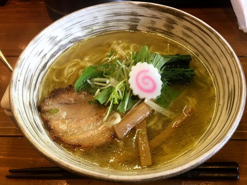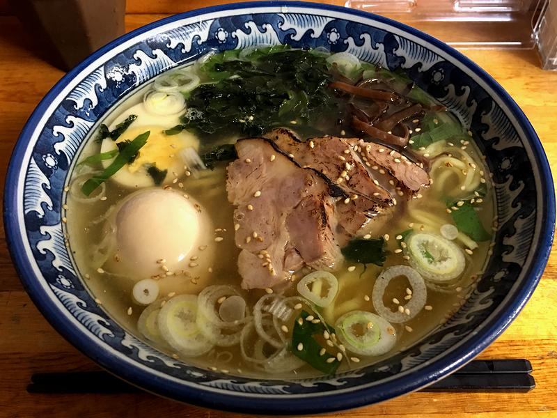 それでいただいたのが、こちらの代表メニューである塩そば。個人的にだいぶ久しぶりとなりました。で、早速ツユからいってみたところ、じわっと旨い澄んだスープに良い塩梅の塩ダレが加わり、更に今日のは油でコッテリ感がわりとプラスされている印象。そこに、ネギと共にこちらの塩そばの特徴と思っている青ジソが香り、もう。また麺は、中くらいの太さでわりと角張った形状のもの。ストレートっぽいのですが微妙なねじりも付けられているようにも感じ、その食感は、ムチっモチっとしていて艶めかしく。そして具は、枚ではなく個と表現した方が良い、バーナーで表面を炙ったチャーシューが2つ。今回のもホロっトロっと解ける食感に、肉自体の味も楽しめる極上の仕上がりです。それと元から半個分入る味付けたまごですが、今回は贅沢にも1つ追加。ラーメン店では珍しくなってきた感もある固ゆでタイプの味付け玉子ですが、個人的には半熟タイプと同じくらい好き。特にこちらのは、味付けが濃すぎず玉子の味も良くわかり、更には、この塩そばにも合いますね。あと、ワカメはこれまで、わりと初めの方に(故に結構固い歯応えの時に)まとめていただいていたのですが、今回、思うところあって全体に散らしてから馴染ませるようにしていただいてみたところ、こうしていただく方がラーメン全体の風味も良くなって美味しく感じました。
