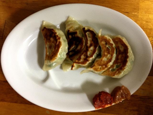 写真を盛大に失敗して申し訳ないのですが、今回は久しぶりに焼き餃子を。添付の味噌and辛子味噌をお酢に溶いていただくのですが、これが旨いんですよね。また、餃子自体も、それほど厚くないけどしっかりとした皮、中のプレーンかつジューシーな餡のそれぞれが良くって。実は、何も付けずそのままいただいてもいけるんです。