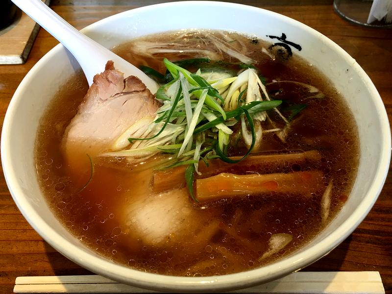 それで今回いただいたのが、こちらの基本と言うべきラーメンなのですが、まさしく、シンプルイズベストなんじゃないでしょうか?それを特に感じるのがツユで、ベースとなる出汁は、(1杯の値段を考えると)原価を掛けて様々な素材を使いまくっているわけではないとは思うのですが、動物系の旨味は十分ですし、更に表面に浮く油や、良い感じで味付けする醤油ダレ、薬味的にあしらわれた白ネギなど、味を構成する要素はさほど多くないものの、それら全てが十二分に力を発揮して、味を作り上げているように思えるのです。(と、自分でも書いていて「何言ってんだこいつ」的な表現になってしまったのですが、要するに、アッサリしているけど美味しいツユということで。)そこに合わせる麺は、確か自家製だったと思うのですが、やや平べったい形状の縮れ麺で、太さは中くらいながら、ムチシコっとした強めの弾力が楽しめる歯応えが印象的。それに加え、ツルツルっと入っていく喉越しも良いですね。そして麺と並んで印象的なのが、大判のチャーシュー。今回は指定しなかったのでロース肉を使ったものですが、適度な歯応えと肉本来の味わいが楽しめる仕上がりになっています。そこに、良い塩梅に味付けされた極太のメンマが加わって、繰り返しますが、シンプルながらも完成された1杯になっていますね。
