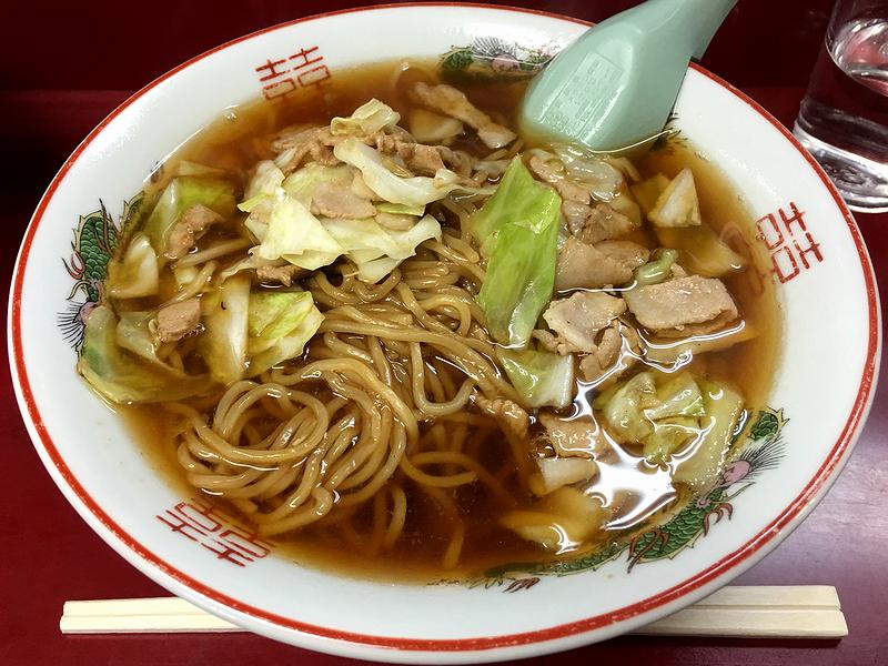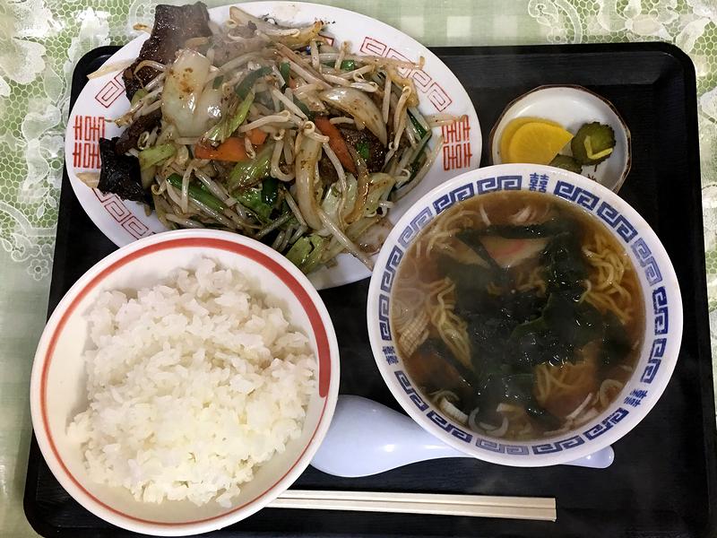 それで登場してまず、半ラーメンから。こちらのノーマルなラーメンは以前いただいた事があったのですが、その時と違って、動物ベース?の出汁ベースのツユはスープ代わりにいただくには丁度良い優しめな味付け。最初はノーマルでチュルチュルっとした麺をいただいたあと、更に卓上のコショウとお酢を投入し、よりスープらしくなるよう味変を試みたところ、これがまたバッチリ。そんな時、具のワカメが良い風味出しますね。そしてメインのレバ炒めですが、「ニラレバ」と名乗らないのはニラの分量が野菜全体の中では少なめだからですかね?もっとも、ニラの他、モヤシ、ニンジン、タマネギ、キャベツと種類豊富なのが良いのですが。またレバーは薄切りのものが結構な枚数入っていて満足度高いです。それらが、ハッキリしているけど濃すぎない塩梅のタレで炒め合わせられ、もう。盛りの良いライスと共にワシワシといただき、最後は残った具材と汁共々(お行儀悪いですが)オンザライス。特に、具材から出た旨味のある水分と相まった汁は、たまらないものがありますね。