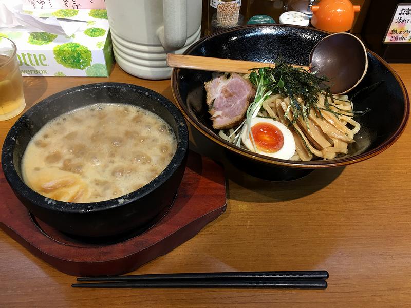登場して今年も「海老の香り、強っ!」と軽く驚くのですが、沸騰した状態で登場する付け汁からは、湯気と共に海老の香りがモリモリと漂って来ます。それは、スクエアな形状でグミグミっとしたコシの強い麺を浸けて味わっても同様で、海老の風味と旨味が、ベースとなっている濃厚豚骨系?の旨味とコッテリ感共にゴリゴリと迫ってきます。ただそのお陰か、昨年同様、塩気が少し控えめに感じてしまうというか。(個人的には、もう少しばかり味付けが濃い方が好みだったりします。)そして具は、付け汁に投入するとホロッと柔らかくなるチャーシュー、良い塩梅の半熟味玉、そしてこれまた良い塩梅のメンマといつもどおり。それらを挟みつつ、途中から麺に卓上のニンニク酢を絡めつつ、並盛りでも360gある麺をいただき、今回はこれまでの半ライスではなくスープ割りで〆ましたが、ライスよりもより、付け汁の味わいというか素材感がダイレクトに感じられますね。(ここで、ニンニクが結構効かされていたことに気づいたのですが、途中から麺に絡めていただいた卓上のニンニク酢の影響ですかね?)