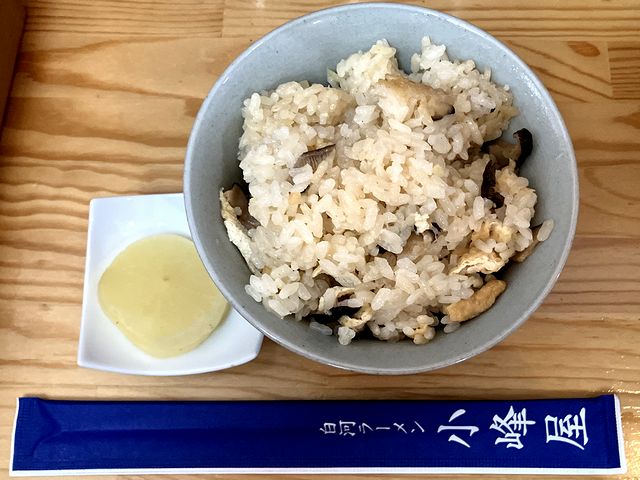 で、ショウガが効き、椎茸と油揚げの旨味が染みたご飯は、やっぱり良いなぁ、と。味付けか濃すぎないのも美点というか、ラーメンと一緒、お通し代わりのお新香や、添えられたたくあんと一緒にいただいても、丁度良いんですよね。
