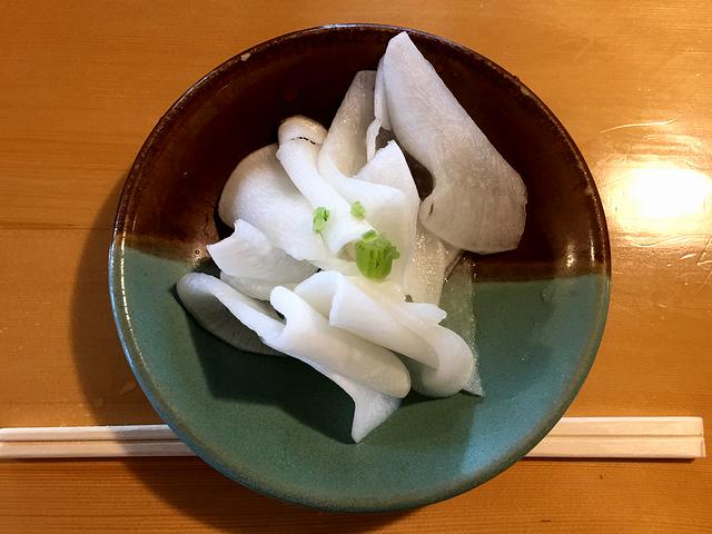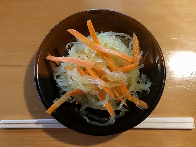 それでまず登場したのが、いつもの大根甘酢漬と、入口の所にあった「本日の野菜」の貼り紙から注文したこちらの品を。ちなみにそうめん瓜は、そうめん南瓜や金糸瓜の名前でも知られる野菜で、個人的には酢の物くらいでしかいただいた事が無かったのですが、ピリッとコショウが効いたフレンチドレッシングとも良く合いますね。また、そうめん瓜だけでは控えめな味と歯応えを太めのニンジンが補っていて、これがまた良かったです。