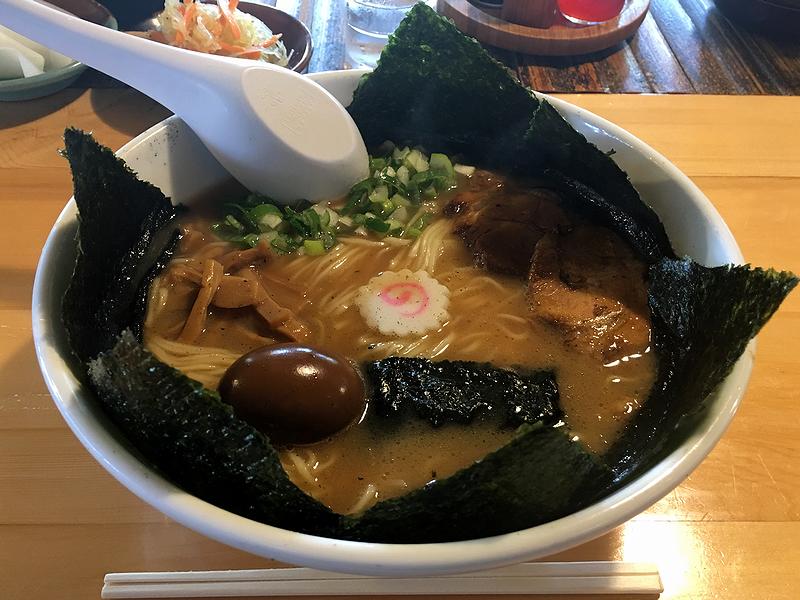 そしてメインのラーメンは、久しぶりのバカうまを。早速バカうま占用の巨大なレンゲでスープからいってみると、和風豚骨醤油味のスープはまろやかかつ良い塩梅。こちらのお店の夏場のスープは、個人的にライト目に感じることが多かったのですが、今回のはしっかりとしたまろみと奥行きがあります。また細い平打ちストレート麺は、ツルッツルの啜り心地。あと具のチャーシューは、ホロトロの食感。固ゆでの味玉はホクホクの黄身と味加減が良く、メンマもちゃんとしています。更に今回は、個人的に大好きなのりをトッピングで追加。こちらの和風豚骨醤油スープには、とても合うことを再認識いたしました。