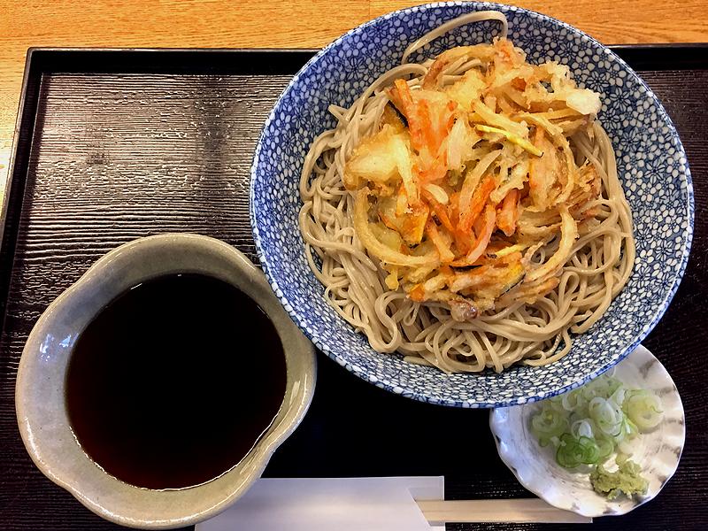 その冷しそば。大盛りにしたのでまず見た目からしてボリューミーというか、100円でここまでソバの量が増えるのは、何とも気前が良いですね。(ちなみに、50円増しの中盛りでも結構増えます。)で、早速、そのソバをそのまま口に入れると、細めながら歯応えがあり、そして喉越しも良し。次に、ツユに浸けてガバっといただけば、今度は不揃いに切られたその幅が面白い食感を生み出します。またそのツユは、ダシ感が結構しっかりあるのですが、肝心の味加減は、濃すぎないというか、ソバをたっぷり浸けていただくと丁度良い、とても「冷やし」らしい塩梅。更に甘味控えめなのが個人的にはとても好みです。ちなみにこちらのツユは、今回のように注文時に何も言わないと冷たいものが出てきます(なので初めていただいた頃は、お店でいただく冷しそば=ツユが冷たいのが当たり前と思い込んでいました。)が、以前はたしか暖かいのも頼めたかと。そしてかき揚げは、タマネギをメインに、ニンジン、カボチャ、サツマイモ、インゲンと野菜の種類が豊富。揚げたてで、食感はカリっとサクっとクリスピー。それをまずは、ツユに浸けて単独で味わい、次にツユの中にズブと投入。あとは、(大盛りにしたので)たっぷりのソバと共にいただけば、もう。たまりませんね。