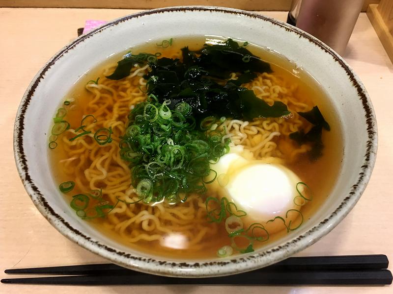 それでいただいたのがこちらの品。西日本で見かける、中華麺を使ったいわゆる「黄そば」というもので、個人的に結構好きだったりするんですよね。で、まずは、色的に関西風に感じるツユからいってみたところ、ちゃんと出汁感があって、旨味も強め。塩気もちゃんとあって、バランスの取れた旨い味です。また麺は、ほんの僅かな滑りというか小麦粉感があって、シコっとした食感共々茹で立てを感じる仕上がり。そして具は、温泉玉子とワカメなのですが、特にワカメが良く合いますね。あとこれなら、トッピングとして売っていた天ぷらを入れても旨そうです。