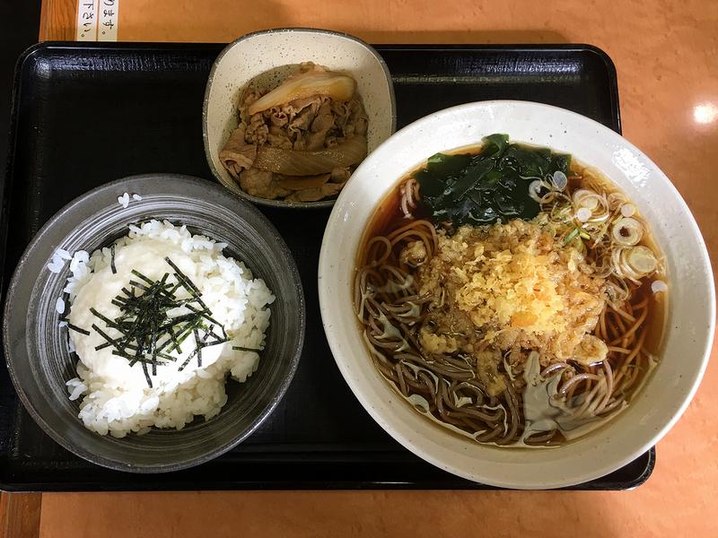 それでいただいたのが、朝限定のこちらの品。ちなみにそばに載った天かすはサービスで、店員さんにお願いすれば持ってきて貰えます。で、早速そばからいってみれば、つゆには出汁感もあって、細めのソバも良い感じ。これまで何度かいただいているそば吉野家さんですが、ほんと、値段を考えれば立派なそばだと思いますよ。あと牛小鉢は、途中からそばに入れたりとろろご飯にトッピングしたりと楽しみました。