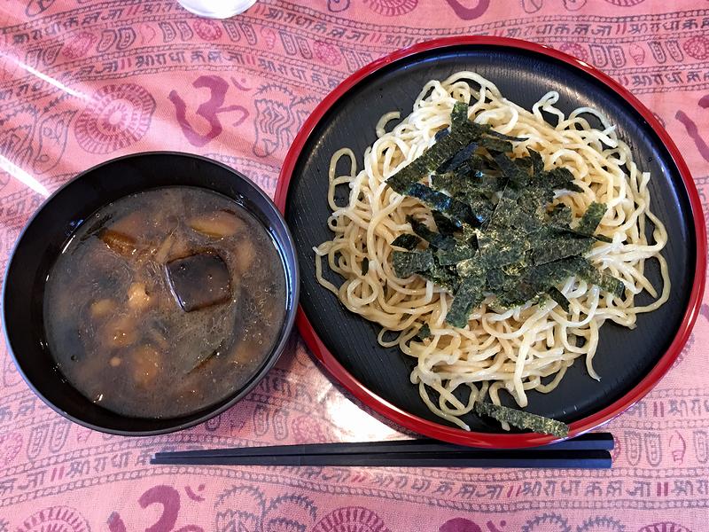 それで味噌ラーメンは家人にまかせ、私はレギュラーメニューではないらしい壁の貼り紙にあったこちらの品をいただいてみることに。ちなみにその貼り紙には、具がナス、タマネギ、エノキ、鶏肉であることと、麺が1玉であることが書かれていました。で、ちょっとだけ待って登場したのですが、「冷やし」だけあって付け汁には氷が。早速麺を付け汁に浸けひと啜りしたところ、何とも懐かしい!私の実家だと、うどんをいただく際の付け汁(ちなみに、実家では茹でたうどんを大きなザルに盛り、めいめい付け汁に浸けていただくというスタイルが主でした。)に、キノコとナスなどを油で炒めたものを甘じょっぱい醤油味に仕立てることがあったのですが、それを思わせる味わいがするではありませんか。もっともこちらは、更に鶏肉など(余談ですが、実家のうどんの付け汁には、鶏肉入りの醤油味も多かったのですが、その際、他の具は薬味のみでした。)も入り、更に豪華というか、中華麺に合うようチューニングされているのですが。またその麺は、手打ちと機械製麺のいいとこ取りしたハイブリッド麺だそうですが、冷たく締められることによって更にコシが増し、それだけでも美味しくいただけました。ちなみに、1玉じゃ瞬殺だったというか、いただいている最中「大盛にしとけば良かった」と何度思った事か。