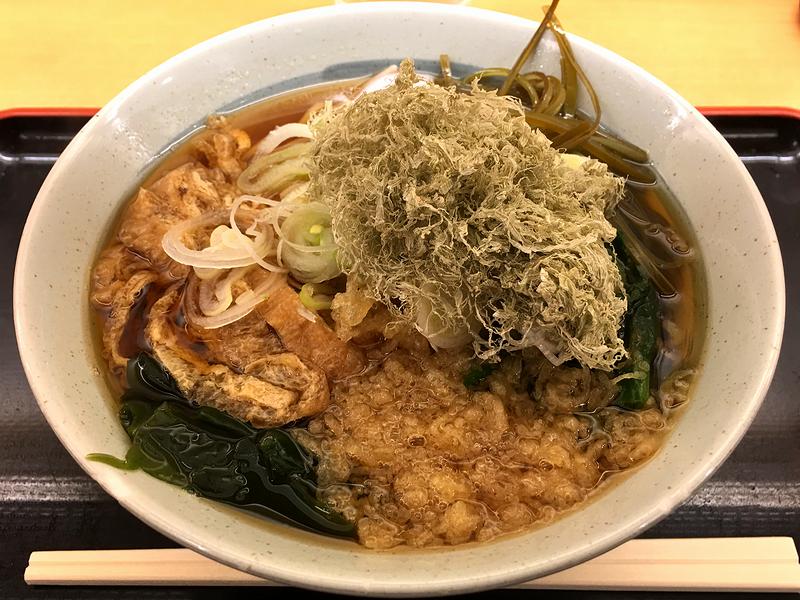 それで、ほんのちょっと待ってから登場したこちらの品。早速つゆからいってみたところ、出汁の香りが結構あって、味付けは甘さ控えめの醤油がビシっと濃いめな、何とも好みの味。これだけしっかりとした味なら、個人的定番のかき揚+玉子でも良かったかもしれません。またそばは、何と注文が入ってから茹でていて(お陰で時間的にちょっと焦ったのですが)、そのお陰で香りはそこそこなれど、歯ごたえ、喉越しはとても良いです。そして具は、刻み油揚げ、天かすに、昆布はとろろ昆布と細切りの煮たものの2種類、そしてワカメとほうれん草、あとカマボコが1切れと、ほぼ植物性なれどバラエティ豊かです。