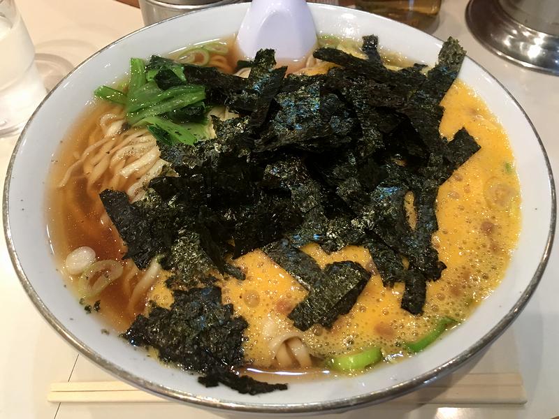 そんなわけでその納豆らあめん。まずは、納豆の影響がなさそうな部分のスープからいってみたところ、ベースは満来さん同様、動物のガラ系ですかね。ただ、それほど強く主張する訳ではなく、それほど濃くない醤油味と相まって、ほんとにあっさりという印象です。また上に載った納豆は、玉子を入れて良くかき混ぜた感じのフワトロ感。そこにピロシコツルっツルの麺が、特に納豆と良く合いますが、更に、わりとたっぷりめに散らされた海苔がこれまた相性が抜群というか、この香りがないとこの品が成り立たないようにも思えます。あと、他の具はほうれん草と薬味のネギ白だけで、肉っ気が全くないのがスパルタンですが、麺の量が多く食べ応えは十分でした。
