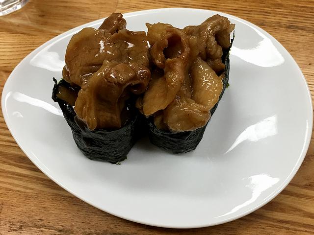 こちらは、一緒にいただいたもの。今回の旅行で豚丼をいただくことが出来はなかったので、というわけではないんですが。で、軍艦の上に載った、甘辛いタレの絡んだ豚肉がボリューミー。