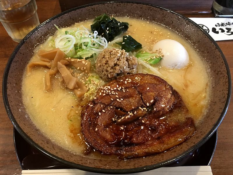 それで今回いただいたのが、日光味噌の「特製」を。ちなみに、「特製」が付かない「日光味噌ラーメン」には味玉が入らず、単に「味噌ラーメン」となるとチャーシューが入らないようです。で、早速、スープからいってみたところ、わりとコッテリ感のあるベースに、甘味の効いた味付けが特徴的。あと味噌は、江戸時代から続く日光の老舗で作られたものを使っているそうなのですが、その使い方は味噌のエッジを立たせるのではなく、適度に角が取れたまろやかな感じにしているような気がします。そして麺は、ウエット感のあるムチっとした食感のもの。スクエアな断面で、どちらかというと細めでしょうか。あと具ですが、丼に盛られる前にたまり醤油のタレに浸けられるチャーシューは、ホロトロの食感で、見た目に反してそれ程味は濃くなく甘味が効いています。また味玉は黄身がトロトロのタイプ。他には、「特製」や「日光」が付かないものと共通の、スープと共に煮込まれるモヤシなどの野菜類、挽肉、ワカメ、メンマ、薬味の白ネギ。それにしても、スープ自体の情報量がわりと豊富なのに加え、具の種類も多いので、トータルだと味の情報量がかなり多いですね。