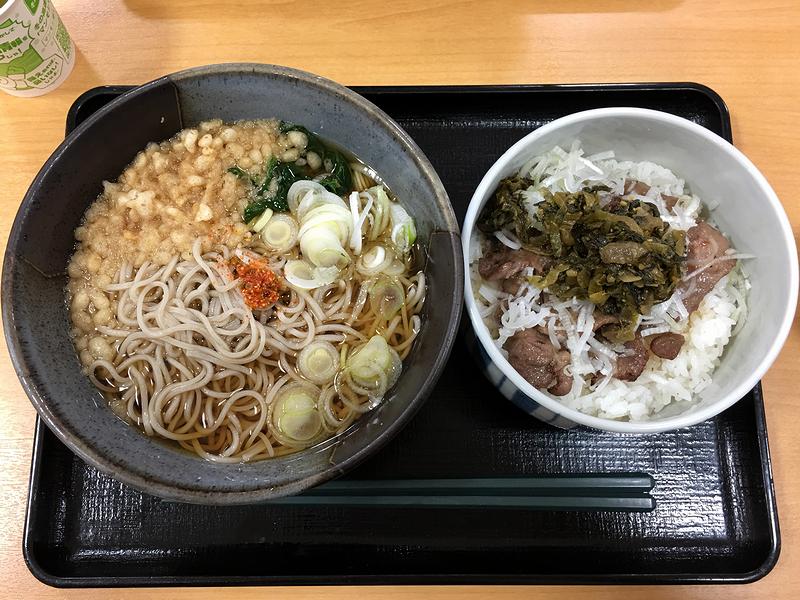 そこでいただいたのが、牛タンが諦められなかったというわけではないんだけど、こちらのセットを。で、まずは揚げ玉が載ったそばですが、つゆの塩気も出汁感も普通。食レポとしてあるまじき表現なのですが、ほんと、どこか濃いとか薄いとかはなく、揚げ玉のコクと香ばしさも相まって、これはこれで悪くないかと。ソバ自体は、冷凍か茹で麺か判らなかったのですが、若干柔らかめで自然な食感でした。そしてミニたん塩丼は、こういう所のものなので牛タン自体が薄めで歯応えも若干固めなのは仕方がないのですが、香ばしさと丁度いい味付けが結構美味しく、また、付け合わせの高菜も良かったです。