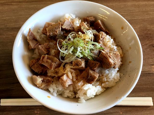 こちらは、一緒にいただいたもの。数量限定メニューのようですね。それで、ご飯の上に角切りのチャーシューと白ネギが載っているのですが、チャーシュー本体の具合はもちろんのこと、タレの味加減、効かせ加減が絶妙というか、ラーメンと一緒にいただいて丁度良いです。また、コショウがぴりっと味を締め良い感じ。個人的にチャーシュー丼的品って一度は頼むんだけど、その味がサイドメニューというよりも単品で完結しちゃっているものが多く、ラーメンと一緒にいただくと味が強い気がしてあまりリピートはしないのですが、これはコンスタントにいただきたくなるようなサイドメニューですね。