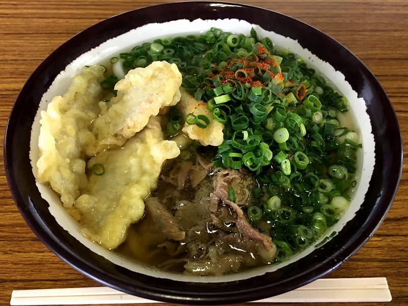 それでいただくのは個人的に好きな肉うどんと決めていたのですが、「九州と言えばごぼう天だろう」ということで食券を買って追加。ちなみに天ぷら系は、ごぼう天の他に海老天もありますが、かき揚げはなし。あと丸天や、サイドメニューにかしわめしが有るのが九州っぽいですね。それでまずはつゆを、具の肉が載っていない方からいってみたところ、その出汁は羅臼昆布を使った昆布だしとのことですが、旨味がとても豊か。味加減も丁度良く、これだけでも美味しいのですが、ちょいと啜る場所を変えて牛肉部分をいけば、そこに甘辛く煮た牛肉から出た旨味や脂のコクが加わり、味が更にグレードアップするという。この牛肉の味加減も丁度良く、また若干ワイルドな牛の風味も、たっぷりと載せてくれた青ネギがカバーしていますね。そしてうどんは、九州らしく、ちゅるちゅるっとした柔らかさですが、コシがないわけではない感じ。茹で麺の自然な食感が、個人的には好ましく感じます。あと追加したごぼう天ですが、ゴボウ自体が太くて立派。またコリジョキっとした歯応えを残して仕上げている感じですが、決して固すぎないのが良いですね。