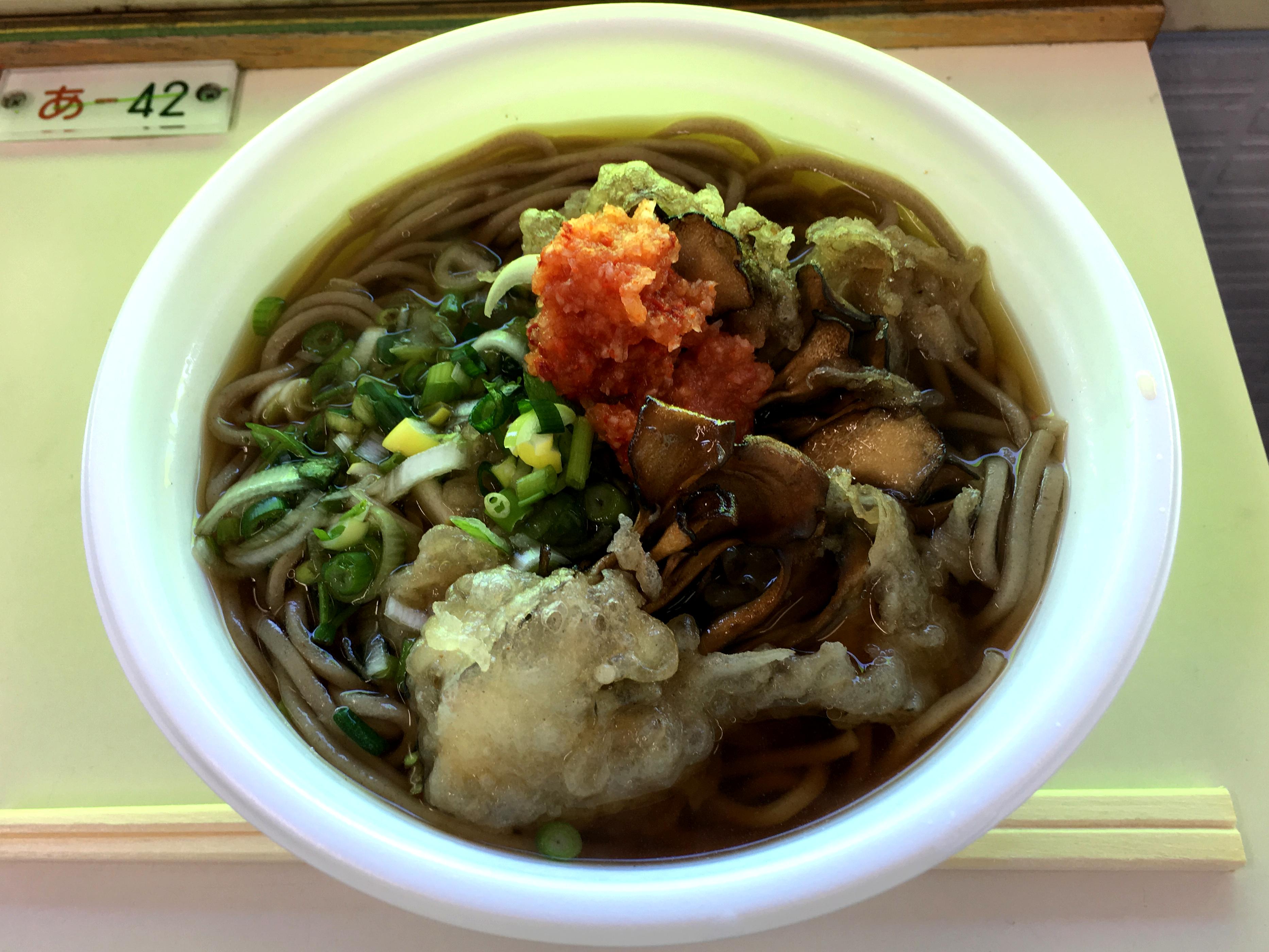 それでつゆは、ダシ感はあまりないものの、濃くなく薄すぎない味加減で、ある意味安心というか。またソバは、自席まで持って帰っていただいたとはいえ、ちょっと柔らかめの食感。もっとも、個人的には柔らかい麺好きなので全く問題ないのですが。あと、つゆと一体化というか良く馴染んでいた様に感じました。そして舞茸の天ぷらは、タイミング的に揚げ置きでしたがまだサクッと感と香ばしさがあって、更には青ネギと紅葉おろしという薬味が面白かったです。