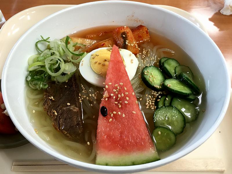 それでその冷麺。冷たいスープは、牛の他に、汁キムチの発酵味ではなくどこか馴染みのある和風っぽいダシというか旨味が効いてるように感じました。なので、とても食べやすい味ですね。また、ウェーブがかった麺はかなり太めで、口に入れるとゴワっと硬質な口当たり。個人的には冷麺といえば、細くてゴムゴムした食感の麺というイメージなのですが、これはこれで良い感じですね。ちなみに、盛岡で冷麺をいただくのは初めてなのですが、当地ではこのような麺が一般的なんですかね?それから、辛味担当のキムチは白菜ではなくカクテキというのも以外なのですが、味のメインとなる牛とはこちらの方が合っている気も。そして具の牛肉は、ホロっとした食感に甘じょっぱい味が染みてて良いですね。あと、ナシやリンゴではなくスイカが載っていたのが面白いです。