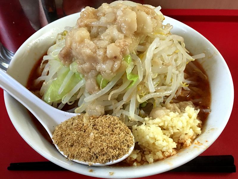 それで入店時に食券を購入したのがこれらの品。ちなみに辛ラーメンは初めていただくこともあって辛さ変更(食券購入直後に申請が必要)はなしで、それとコールはニンニクアブラでお願いしました。で、登場したラーメン。まずは魚粉を混ぜないように、けどスープを野菜に絡めていただいたところ、スープ表面が赤っぽくなっていますが、そんなに辛くないという印象。もっとも、辛味だけが突出しない、丁度良い加減だとも思いましたが。また、ベースの豚スープは、こちらのお店に初めてお伺いして以来最高の豚濃度に感じたのですが、ノーコールでも結構(醤油っ気というか塩気が)カラメで、すき焼き風にしていただく生玉子が大いに役に立ちました。そして麺は、これもこちらのお店に始めてきて以来一番好みと言えるチュルムチムチっとした食感のもの。醤油が良く染みてこちらもだいぶカラメに感じます。あと豚は、旨味がまだ十分に残りつつも、歯応えが適度で良いですね。更に途中から魚粉を絡めたところ、大安定ではあるのですが、今日のスープは豚感が強かったので、それがスポイルされてしまうという意味でちょっと勿体ない感もありました。